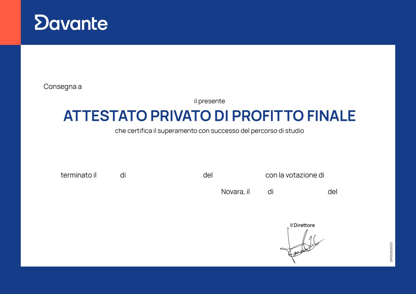 Dopo aver completato con successo il tuo periodo di formazione, riceverai il tuo attestato privato di profitto finale Davante, in cui si certifica che hai completato la tua formazione in modo soddisfacente.